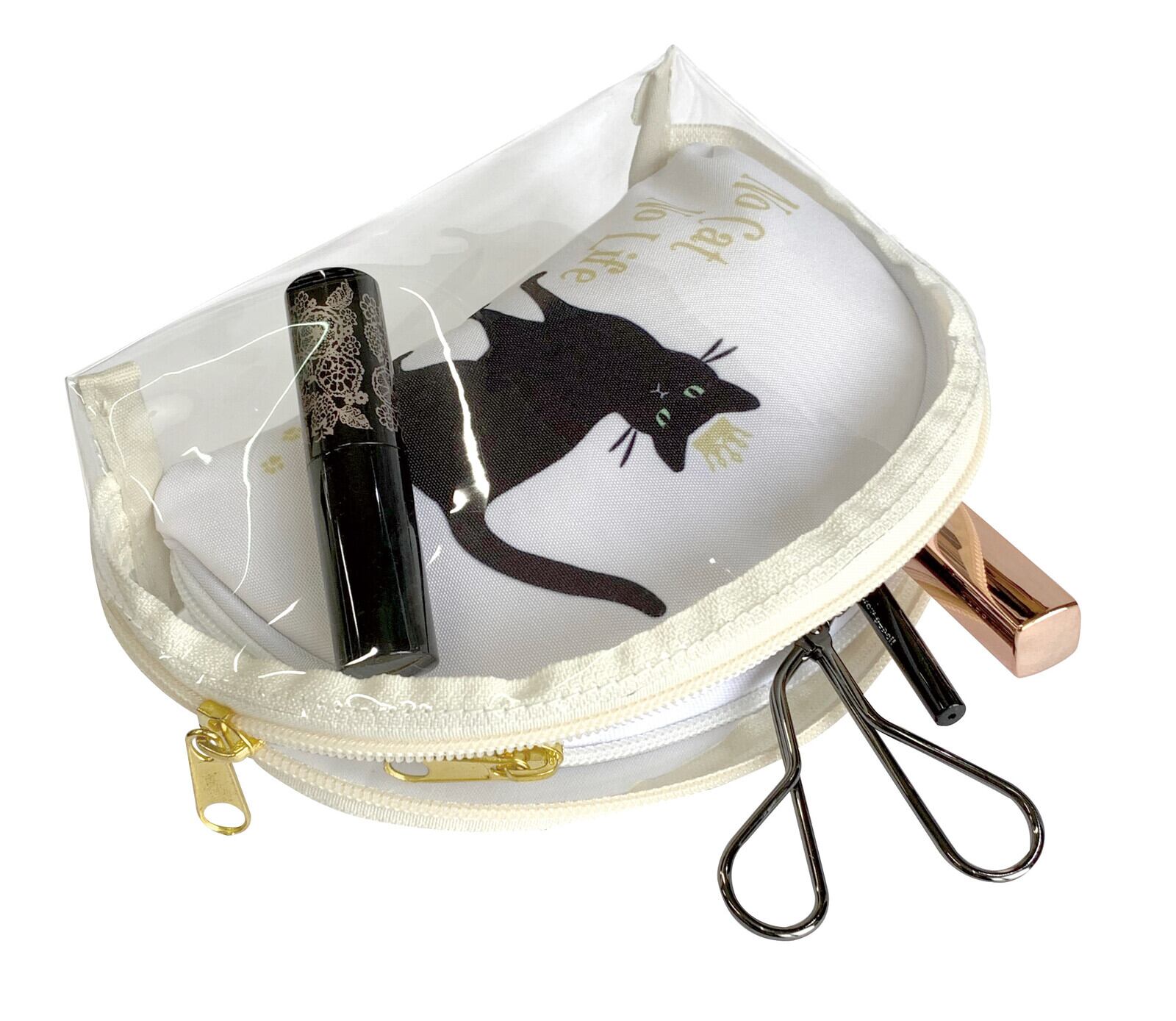 ネコのデザインが描かれた、お洒落なポーチです。オシャレなネコのラインナップで普段使いにもギフトにも♪ 【素材・成分】 ポーチ:ポリエステル/クリアポーチ:塩化ビニル樹脂 【生産地】 中国